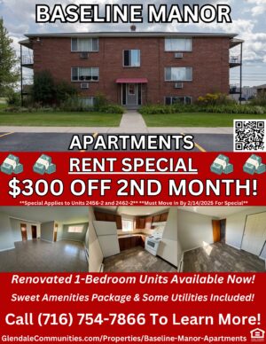 Baseline Manor $300 Off 2nd Month Rent Special Flyer Ending 2_14_2025