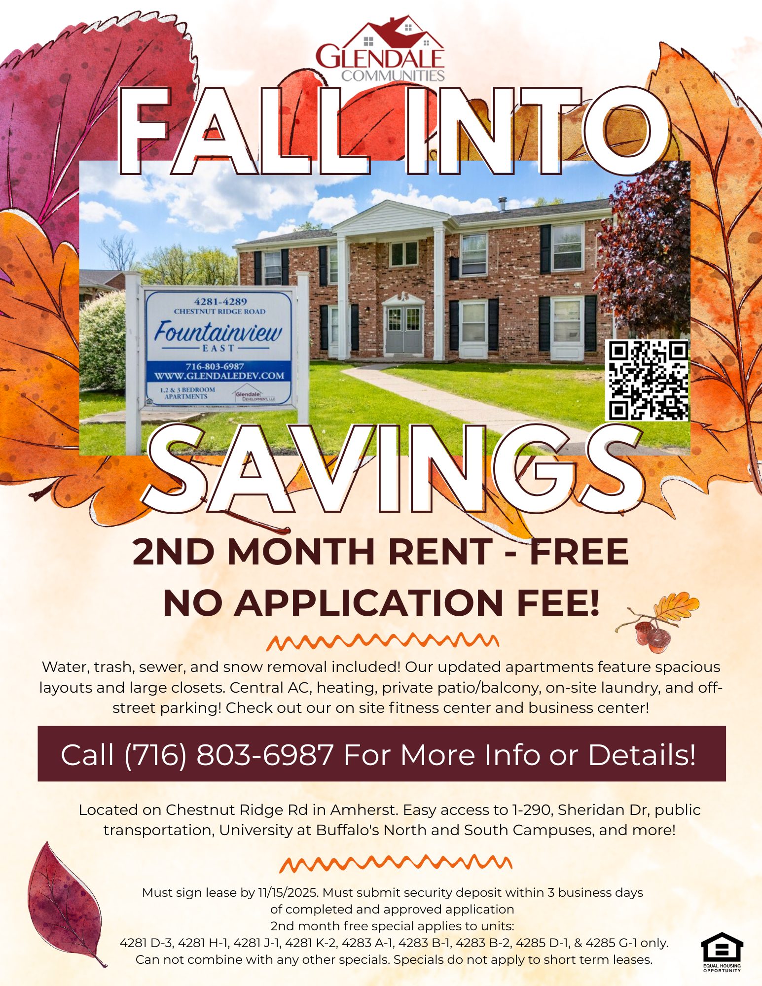Check out our detailed floor plans, unit-level images, interactive virtual tour, and application process. Then call us to book a tour today of a 1, 2, or 3 bedroom apartment at Fountainview East on Chestnut Ridge Road! Once you see our Amherst, NY apartments in person, you will not want to live anywhere else.