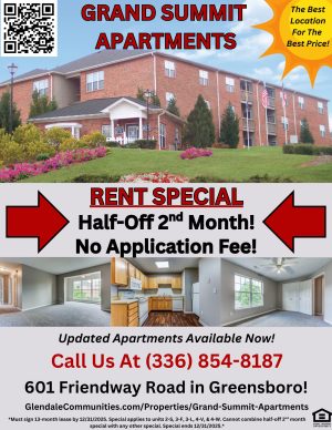ย Experience the massive difference with these beautiful apartments in Greensboro, and let everyday at Grand Summit feel like a vacation!! We are ideally located on Friendway Rd, just minutes from Wendover Avenue, I-40 (URBAN LOOP) and Guilford College. Our prime location offers unlimited shopping and dining possibilities, yet this property is tucked far enough away that you forget all your worries once you’re home!