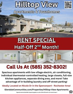 Take the first steps and become a Hilltop View tenant today! Call our Leasing Office at (585) 352-8302. We would love to answer questions you have or set up a tour. Hurry, Hilltop is a top choice for apartments near Rochester!