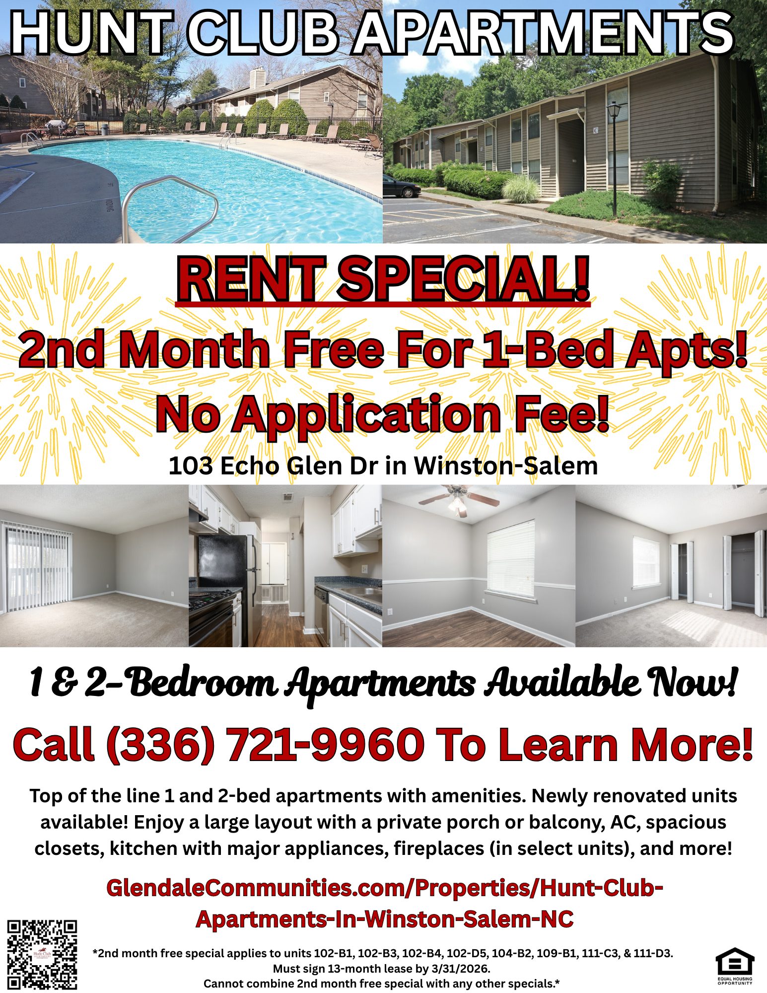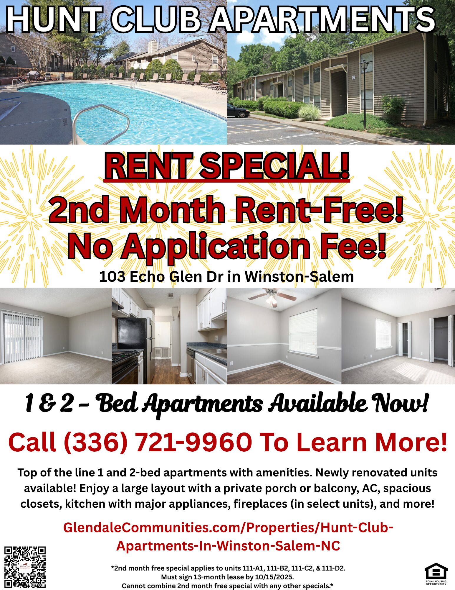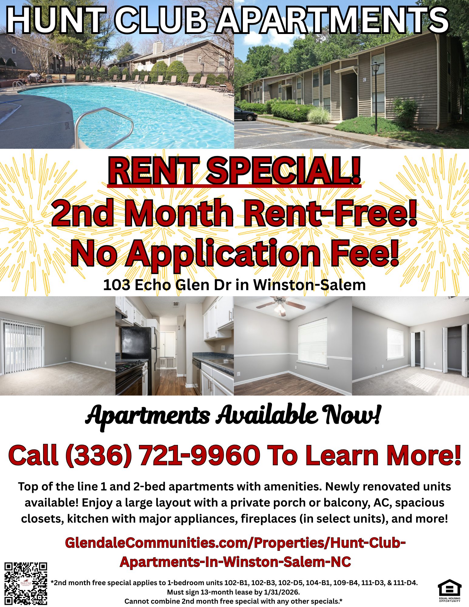 Take the first step in becoming a Hunt Club resident by contacting our friendly Leasing Office at (336) 721-9960! We are always willing to answer questions you have, or set up tours. If you like comfort, exceptional service, great amenities and features, and an ideal location, the Hunt Club Apartments are right for you!
