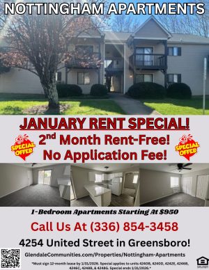 At Nottingham Apartments, we understand that apartment features, price, and customer service are not the only things that are considered when inquiring about apartments. In fact, most people who search a variation of “apartments for rent near me” do so to get a good feel of the location. Luckily, Nottingham Apartments are ideally located on 4254 United Street in Greensboro, North Carolina. We are just minutes from I-40/I-85, major employers, and area universities. There is also plenty of shopping, fine dinning and entertainment possibilities in Greensboro, close to our apartments.
