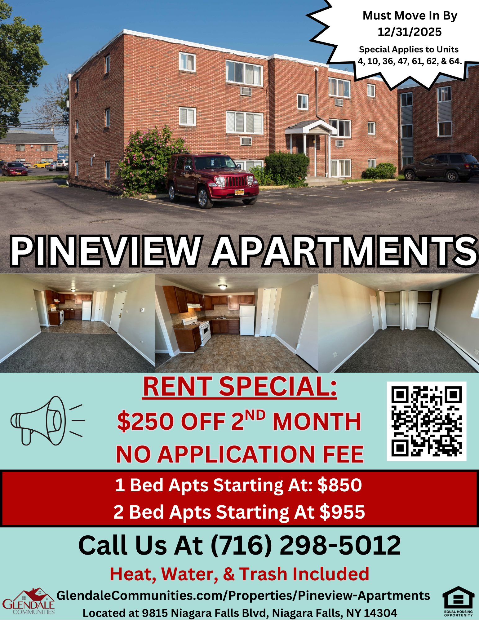 At Pineview Apartments, you get lots of amenities for the price you pay! Enjoy open layouts, air conditioning, spacious rooms, nice carpeting, heating, major kitchen appliances, off street parking, and closet space galore! Heat, water, and trash are included in the rent so you will not have to worry about that. These affordable apartments for rent in Niagara Falls come cable ready too.