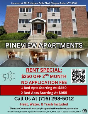 ย Located near major public transportation lines, these apartments are an affordable style of living for anyone looking to reside in Niagara Falls! Learn more about these rentals now before we have no more availability! Please contact the Glendale Communities’ Niagara Falls Office at (716) 298-5012 for more information or to set up a tour!ย