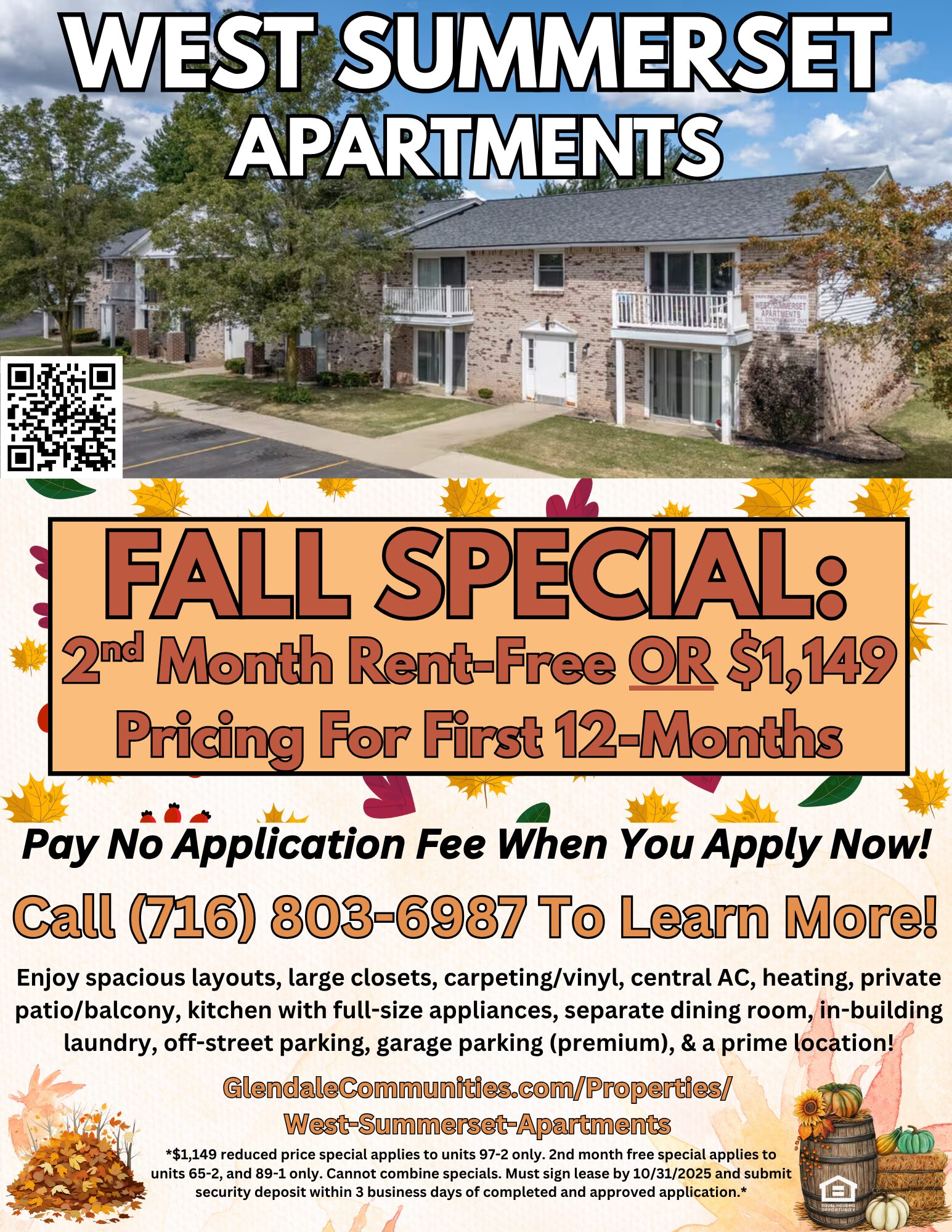 West Summerset Apartments in Amherst NY offers newly renovated 1- and 2-bedroom apartments for rent! Our spacious layouts range in size from 700 – 850 square feet. Furthermore, we have plenty of amenities like large closets, central air conditioning, heating, private patio/balcony, and so much more. Our units have a separate dining area and a modern kitchen with a full-size refrigerator, oven/stove, and dishwasher.